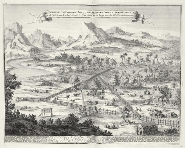 | Keywords: AMH-7266-KB Elephant hunt on Ceylon.jpg Artwork nl Olifantenjacht op Ceylon nl Olifantenjacht op Ceylon De Eliphants-Jagt gedaan in't Jaar 1717 inde Alutcoer Corle in't Dorp Horregelle Linksboven No 14 Legenda A de Noot-Coraal / B Maal-Coraal / C Speel-Coraal / D Een huysje voor den Wel Ed Heer Gouverneur De afbeelding is afkomstig uit het werk 'Oud en Nieuw Oost-Indiën' van François Valentyn Onder de afbeelding wordt uitgelegd hoe de olifantenjacht in z'n werk gaat of how the elephant hunt is organised Atlas of Mutual Heritage kb http //www atlasofmutualheritage nl/en/object/ id 7266 Source at the Atlas of Mutual Heritage en Subjects banderole / cartouche / ornamentation bird's-eye view / elevation elevation / bird's-eye view key survey / view fauna fence / kraal building Person European Asians Africans flora nl Onderwerpen banderol / cartouche / versiering vogelvlucht / opstand opstand / vogelvlucht legenda overzicht / aanzicht fauna omheining / kraal gebouw Persoon Europeanen Aziaten Afrikanen flora Inscription De Eliphants-Jagt gedaan in't Jaar 1717 inde Alutcoer Corle in't Dorp Horregelle author I C Philips fec direx nl 1726 Creator Jan Caspar Philips Creator J van Braam Creator Gerard onder de Linden nl Jan Caspar Philips graveur / etser J van Braam uitgever Gerard onder de Linden uitgever en Jan Caspar Philips engraver / etcher J van Braam publisher Gerard onder de Linden publisher Institution Koninklijke Bibliotheek nl gravure op papier en engraving on paper Size cm 31 38 5 accession number 185 A 5 deel V II na p 46 PD-Art-100 Dutch East India Company 1726 |