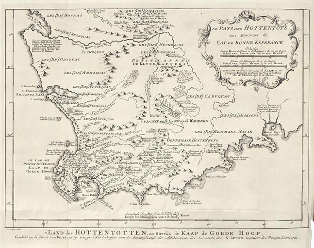 | Keywords: AMH-7958-KB Map of the Cape of Good Hope.jpg Artwork nl Kaart van de Kaap de Goede Hoop nl Kaart van de Kaap de Goede Hoop t Land der Hottentotten omstreeks de Kaap de Goede Hoop / Geschikt op de Kaart van Kolbe en op eenige Handschriften van de Bewaarplaatse der Aftekeningen des Zeevaards door N Bellin Ingenieur des Fransen Zeevaards Le Pays des Hottentots aux Environs du Cap de Bonne Esperance Cette Carte est dressée sur celle de Kolbe et sur quelques Manucrits du Depot des Plans de la Marine Par N Bellin Ing r de la Marine en Map of the Cape of Good Hope t Land der Hottentotten omstreeks de Kaap de Goede Hoop / Geschikt op de Kaart van Kolbe en op eenige Handschriften van de Bewaarplaatse der Aftekeningen des Zeevaards door N Bellin Ingenieur des Fransen Zeevaards Le Pays des Hottentots aux Environs du Cap de Bonne Esperance Cette Carte est dressée sur celle de Kolbe et sur quelques Manucrits du Depot des Plans de la Marine Par N Bellin Ing r de la Marine Atlas of Mutual Heritage kb http //www atlasofmutualheritage nl/en/object/ id 7958 Source at the Atlas of Mutual Heritage en Subjects chart / map / plan banderole / cartouche / ornamentation nl Onderwerpen plattegrond / kaart banderol / cartouche / versiering en Post this image is related to a VOC trading post called http //www atlasofmutualheritage nl/en/post/ id 429 Saldanha Inscription 't Land der Hottentotten omstreeks de Kaap de Goede Hoop author J v Schley direx nl 1747 Creator Jacques Nicolas Bellin Creator Pierre d' Hondt Creator Jacobus van der Schley nl Jacques Nicolas Bellin landmeter / kaartenmaker Pierre d' Hondt uitgever Jacobus van der Schley direxit en Jacques Nicolas Bellin land surveyor / mapmaker Pierre d' Hondt publisher Jacobus van der Schley direxit Institution Koninklijke Bibliotheek nl gravure op papier en engraving on paper Size cm 19 24 accession number 693 C 6 dl VI na p 433 PD-Art-100 Maps of the Dutch East India Company - South Africa 1747 maps Khoikhoi |