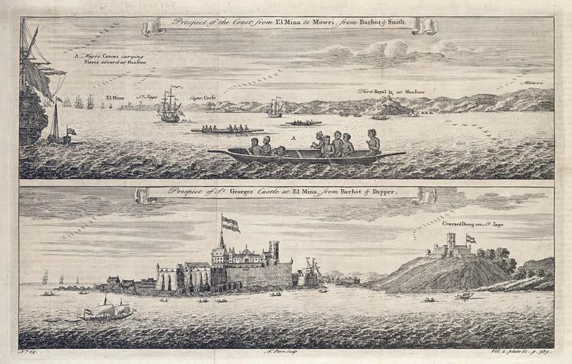 | Keywords: AMH-8175-KB View of the West African coast from Elmina to Mouri and a view of the castle of St. George at Elmina.jpg Artwork nl Gezicht op de Westafrikaanse kust van Elmina tot Mouri en aanzicht van kasteel St George te Elmina nl Gezicht op de Westafrikaanse kust van Elmina tot Mouri en aanzicht van kasteel St George te Elmina Prospect of the Coast from El Mina to Mowri Prospect of St Georges Castle at El Mina Cf Koninklijke Bibliotheek Den Haag inv nr 693 C 5 dl III to p 497 en 693 C 5 dl III to p 461 en 61 B 25 na p 156 Rechtsonder Vol 2 plate 61 p 589 Linksonder No 69 Manfro is de naam van de heuvel waar het fort bij Pocquesoe op stond Het was van 1683 tot 1717 het enige Pruissische fort in Ghana In 1725 kwam het in handen van de WIC en werd het omgedoopt tot fort Hollandia Gezien de ligging op de onderste afbeelding tusen Cabo Cors en Mouree is het waarschijnlijk dat met 'Manfroe' het Deense fort Frederiksborg bij Cabo Cors bedoeld wordt Dat wordt evenals het Pruissische fort bij Pocquesoe met de naam 'Koningsfort' aangeduid en View of the West African coast from Elmina to Mouri and a view of the castle of St George at Elmina Prospect of the Coast from El Mina to Mowri Prospect of St Georges Castle at El Mina Cf Koninklijke Bibliotheek The Hague inv nr 693 C 5 dl III opp p 497 and 693 C 5 dl III opp p 461 and 61 B 25 after p 156 Bottom right Vol 2 plate 61 p 589 Bottom left No 69 Manfro is the name of the hill on which the fort at Pocquesoe was situated From 1683 to 1717 it was the only Prussian fort in Ghana In 1725 it fell to the WIC and was renamed Fort Hollandia In view of the situation as depicted in the bottom print between Cabo Cors and Mouree it is likely that 'Manfroe' refers to the Danish fort of Frederiksborg at Cabo Cors Just like the Prussian fort at Pocquesoe it was referred to by the name 'Koningsfort' Atlas of Mutual Heritage kb http //www atlasofmutualheritage nl/en/object/ id 8175 Source at the Atlas of Mutual Heritage en Subjects survey / view ship / vessel fortification building house Person Asians Africans banderole / cartouche / ornamentation nl Onderwerpen overzicht / aanzicht schip / vaartuig vesting gebouw huis / woonhuis Persoon Aziaten Afrikanen banderol / cartouche / versiering en Post this image is related to a WIC trading post called http //www atlasofmutualheritage nl/en/post/ id 692 Mouri Inscription Prospect of the Coast from El Mina to Mowri / Prospect of St Georges Castle at El Mina author N Parr Sculp nl 1745 Creator N Parr nl Anoniem / Anonymous uitgever N Parr graveur / etser en Anoniem / Anonymous publisher N Parr engraver / etcher Institution Koninklijke Bibliotheek nl gravure op papier en engraving on paper Size cm 16 25 accession number 3032 B 10 to p 588 PD-Art-100 West-Indische Compagnie 1745 |