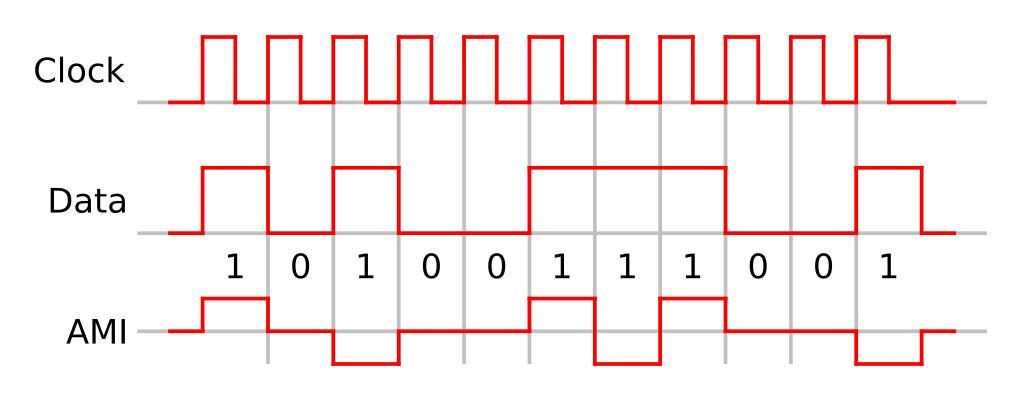 | Keywords: Ami encoding.svg An example of Alternate Mark Inversion encoding showing the relationship between input data clock and the encoded signa The encoded bit sequence '10100111001' It is assumed that the previous '1' was encoded as a negative going pulse 2006-03-15 own assumed Ktims Alternate mark inversion |