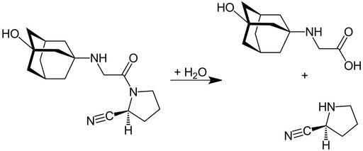 Keywords: Amide Hydrolysis V.1.svg en Amide_Hydrolysis de Amide_Hydrolyse own Jü 12/03/2011 Vildagliptin metabolism Cc-zero Metabolic pathways Chemical reactions