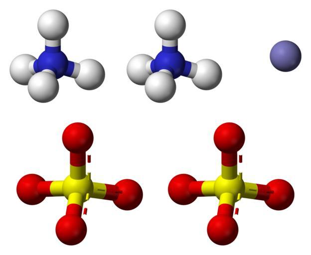 Keywords: Ammonium-iron(II)-sulfate-3D-balls-ionic.png Ball-and-stick model of ammonium iron II sulfate also known as Mohr's Salt showing two ammonium cations top-left one iron II cation top-right and two sulfate anions bottom It can be considered a double salt of ammonium sulfate and iron II sulfate Derived from File Ammonium-sulfate-3D-balls png 2010-11-21 Jynto and Ben Mills Mohr's salt Images by Jynto Ball-and-stick models |