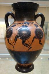 | Keywords: Amphora, Circle of the Antimenes Painter, Greek, Attica, c. 520-510 BC, Side A (Four hoplites running), Side B (Four hoplites standing), ceramic, black figure decoration - Chazen Museum of Art - DSC02671.JPG en Exhibit in the Chazen Museum of Art University of Wisconsin-Madison Madison Wisconsin USA This artwork is old enough so that it is in the public domain Photography was permitted in the museum without restriction 2013-07-21 14 30 58 own Daderot cc-zero Uploaded with UploadWizard Ancient Greek pottery in the Chazen Museum of Art Antimenes Painter Ancient Greek Neck amphoras |