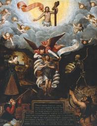 | Keywords: An Allegory of Man.jpg Seven Deadly Sins and Death but is shielded by the Seven Virtues The inscription warns of the dangers of worldly vanity and invites the reader to cast his eyes heavenward to the Resurrected Christ and urges the reader to pray that his soul might reach heaven painting http //www tate org uk/servlet/ViewWork workid 18967 tabview image Unknown painter of the British school 1596 PD-old-100 16th-century allegorical paintings 1590s paintings in the United Kingdom Angels on clouds Archers in art Unidentified painters Paintings in Tate Britain Allegorical paintings of putti 16th-century oil on canvas paintings in the United Kingdom 16th-century paintings of angels with humans Paintings with inscribed scrolls 1590s paintings in private collections Skeletons in art Angels in the air 16th-century paintings of Jesus Christ Paintings of angels in the United Kingdom 16th-century religious paintings in the United Kingdom Christian figures on clouds 16th-century paintings in unidentified private collections 1590s religious paintings |