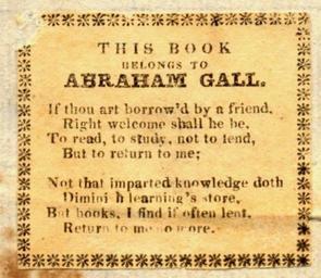 | Keywords: An ex libris poem(1741).jpg left If thou art borrow'd by a friend <br /> Right welcome shall he be <br /> To read to study not to lend <br /> But to return to me;<br /> <br /> Not that imparted knowledge doth<br /> Diminish learning's store <br /> But books I find if often lent <br /> Return to me no more אקס יבריס ע הודעה בחרוזי הקוראת מוצא הישר החזיר את הספר בע יו A new method of chemistry including the history theory and practice of the art / translated from the original Latin of Dr Boerhaave s Elementa chemiae as published by himself by Peter Shaw London T Longman 1741 upload by the http //www facebook com/NationalLibraryofIsrael National Library of Israel facebook page http //www facebook com/photo php fbid 208732815808617 set a 208732795808619 61952 140556749292891 theater http //a6 sphotos ak fbcdn net/hphotos-ak-snc6/200059_208732815808617_140556749292891_889714_4920835_n jpg dl 1 Download Abraham Gall 1741 PD-old-100 Ex libris Ex-libris of the United Kingdom |