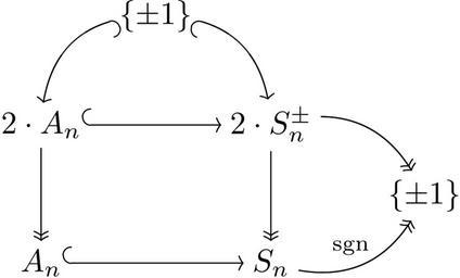 | Keywords: An-Sn-covering-groups.svg Commutative diagram connecting the covering groups of the alternating and symmetric groups Own work by Nils R Barth 2009-11-17 Nils R Barth Released into the public domain by the author TeX source TeX source produced as detailed at meta Help Displaying a formula Commutative diagrams <source lang latex > \documentclass amsart \usepackageall ps xy Loading the XY-Pic package Using postscript driver for smoother curves \usepackage color For invisible frame \begin document \thispagestyle empty No page numbers \SelectTips eu Euler arrowheads tips \setlength \fboxsep 0pt Frame box margin \color white \framebox \color black Frame for margin \xymatrix 6pt \ \pm 1\ \ar -> /_1pc/ddl \ar _ -> / 1pc/ddr \\ \\ 2 \cdot A_n \ar ->> dd \ar -> rr 2 \cdot S_n \pm \ar ->> dd \ar ->> / 1pc/rrd \\ \ \pm 1\ \\ A_n \ar -> rr S_n \ar ->> /_1pc/rru \operatorname sgn end math end frame \end document </source> cc-zero Permutations Commutative diagrams Xy-pic diagrams Images with LaTeX source code |