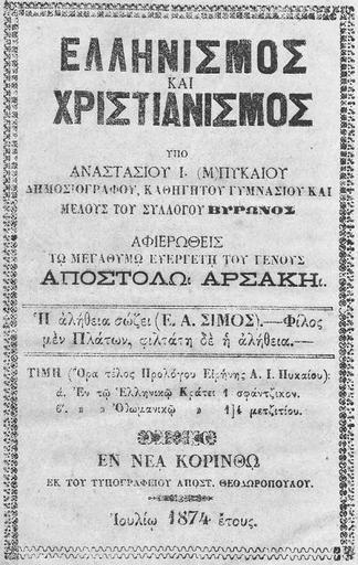 | Keywords: Anastasios Pykaios Christianismos kai Ellinismos.JPG en Cover of Χριστιανισμός και Ελληνισμός Christianity and Hellenism by Anastastios M pykaios Anastas Byku 1874 el Εξώφυλλο α ό το έργο Χριστιανισμός και Ελληνισμός του Αναστασίου υκαίου 1874 http //anemi lib uoc gr/metadata/b/2/9/metadata-264-0000209 tkl author 1874 αρακάτω PD-old 1874 books |