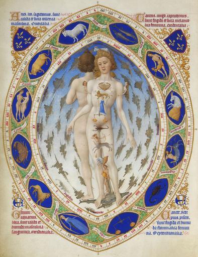 | Keywords: Anatomical Man.jpg Artwork Creator Limbourg Brothers Très Riches Heures du Duc de Berry Anatomical Man Look at the signs of the zodiac They correspond to each part of the body starting with Pisces the feet and working up their way to the head with Aries the ram that has sacred connotations In each top corner are painted the arms of the Duke of Berry Each area is complemented by four Latin inscriptions describing the properties of each sign according to the four complexions hot cold wet or dry the four temperaments choleric melancholic sanguine and phlegmatic and the four cardinal points Aries Leo and Sagittarius are warm and dry choleric masculine Eastern in the upper left; Taurus Virgo and Capricorn are cold and dry melancholy female Western in the upper right; Gemini Aquarius and Libra are hot and humid sanguine masculine Southern in the lower left; Cancer Scorpio and Pisces are cold and wet phlegmatic feminine Northern in the lower right un homme dont les différentes parties du corps sont reliées à un des douze signe du zodiaque des poissons vers le bélier L'homme se dédouble et est entouré d'une double mandorle dans laquelle sont reproduits à nouveau les signes du zodiaque Dans chaque coin supérieur de la miniature sont peintes les armes du duc de Berry « trois fleurs de lys d'or sur fond d'azur avec bordure engrêlée de gueule » Dans chaque coin inférieur est placé le chiffre « VE » ou « UE » enlacés Ces lettres ont fait l'objet d'interprétations diverses il s'agit soit d'une allusion aux premières lettres d'une devise du duc « En Vous » ; soit d'une allusion à la première et dernière lettre du nom « Ursine » Ce nom fait lui-même l'objet d'une double interprétation soit saint Ursin le patron du duché de Berry soit le nom d'une maîtresse que le duc aurait connu en captivité en Angleterre Ce nom se retrouve dans des symboles héraldiques parlants qui parsèment à plusieurs reprises les marges du manuscrit l'ours et le cygne Chaque coin est complété par quatre inscriptions latines décrivant les propriétés de chaque signe selon les quatre complexions chaud froid sec ou humide les quatre tempéraments colérique mélancolique sanguin et flegmatique et les quatre points cardinaux « le Bélier le Lion et le Sagittaire sont chauds et secs colériques masculins orientaux » en haut à gauche ; « le Taureau la Vierge et le Capricorne sont froids et secs mélancoliques féminins occidentaux » en haut à droite ; « les Gémeaux le Verseau et la Balance sont chauds et humides masculins sanguins méridionaux » en bas à gauche ; « le Cancer le Scorpion et les Poissons sont froids et humides flegmatiques féminins septentrionaux » en bas à droite between 1411 1416 Tempera vellum size cm 29 21 Institution Musée Condé accession number Ms 65 f 14v object history credit line user Petrusbarbygere Raymond Cazelles et Johannes Rathofer préf Umberto Eco Les Très Riches Heures du Duc de Berry Tournai La Renaissance du Livre 2001 1re éd 1988 238 p ISBN 2-8046-0582-5 own PD-old-100 Assessments 1 1 ארכיון 22 ספר השעות העשירות מאוד ש דוכס ברי picture of the day 2005 10 26 Homo signorum Très Riches Heures du Duc de Berry Signs of Western astrology Vesica piscis Paintings of nude males Featured pictures of Oise |