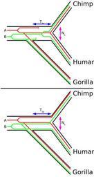| Keywords: Ancestralsizehuman.svg When three species are fairly closely related to each other like human chimpanzee and gorilla the trees obtained from DNA sequence data may not be congruent with the tree that represents the speciation species tree A and B are two different loci In the upper figure they fit to the species tree the DNA that is present in todays gorillas diverged earlier from the DNA that is present in todays human and chimp Thus both loci should be more similar between human and chimp than between gorilla and chimp or gorilla and human The lower graph is different locus A in human and gorilla have a more recent common ancestor compared to the chimpanzee sequence Whereas chimp and gorillas have a more recent common ancestor for locus B which is therefore more similar in sequence between the two The gene trees do not fit to the species tree The shorter internodal time span T<sub>IN</sub> the more common are incongruent gene trees The effective population size N<sub>e</sub> of the internodal population determines how long genetic lineages are preserved in the population A higher effective population size causes more incongruent gene trees Therefore if the internodal time span is known the ancestral effective population size of the common ancestor of humans and chimpanzees can be calculated Chen Li 2001 Chen F C Li W H 2001 'Genomic divergences between humans and other hominoids and the effective population size of the common ancestor of humans and chimpanzees ' Am J Hum Genet 68 2 444--456 http //www pubmedcentral nih gov/articlerender fcgi tool pubmed pubmedid 11170892 Own 2006-08-28 Molgen US Public Domain or free content licenses phylogenetic trees of humans |