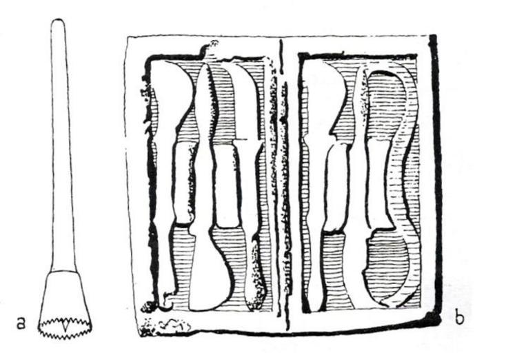 | Keywords: Ancientgreek surgical lang neutral.jpg Instruments used by ancient Greek surgeons Contents a trephine b case of scalpels Derivative of Image Ancientgreek surgical jpg Scanned by User Rmrfstar from page 33 of Singer Charles Underwood E Ashworth 1962 Short History of Medicine Oxford University Press New York and Oxford Library of Congress ID 62-21080 English text removed by User Shinzon PD-Art Version with English text Image Ancientgreek surgical jpg Medicine in ancient Greece Historical surgical instruments Trephines |
