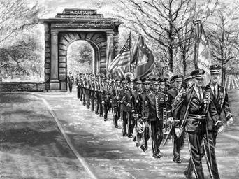 Keywords: ANCpainting.jpg en Painting of the Honor Guard at the Arlington National Cemetary Gary S Schofield Gary S Schofield 2010-04-08 schofldart aol com PD-USGov-Military-Navy McClellan Gate Black and white drawings