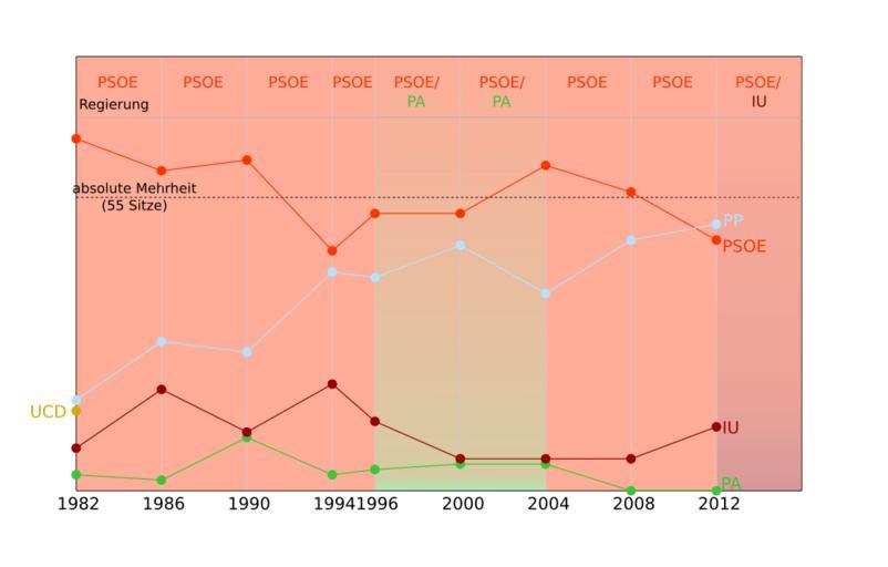Keywords: Andaluparlhist.svg es Parlamento de Andalucía - Escaños de los partidos 1982-2008 de Sitzverteilung Parlament Andalusien 1982-2008 own Marnal 2011-10-10 Cc-zero Politics of Andalusia