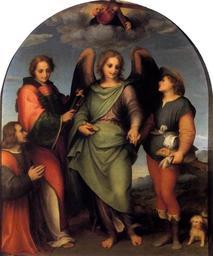 | Keywords: Andrea del Sarto - Tobias and the Angel with St Leonard and Donor - WGA0380.jpg Artwork Creator Andrea Del Sarto 1512 Panel size cm 178 153 Institution Kunsthistorisches Museum Cabinet 04 object history de Stiftung des Seidenkaufmanns Leonardo di Lorenzo Morelli für die Familienkapelle in S Lucia in Settimello bei Florenz; Kurz vor 1634 als Geschenk der Familie Morelli an die Medici; 1637 1663 Inv der Galerie Palazzo Pitti; 1695 Inv von Poggio Imperiale; 1783 in der Tribuna in den Uffizien Florenz; 1792 durch Tausch aus Florenz nach Wien credit line accession number Inv -Nr GG 182 WGA link 380 http //www wga hu/art/a/andrea/sarto/1/tobias jpg http //www wga hu/html/a/andrea/sarto/1/tobias html PD-old-100 painting religious Italian 1501-1550 DEFAULTSORT Sarto; Tobias and the Angel with St Leonard and Donor Paintings by Andrea del Sarto in the Kunsthistorisches Museum 1512 paintings Standing angels 16th-century oil on panel paintings People with fish in art Christian figures on clouds Green clothing in art angel People with dogs in art Pointing in art Paintings of Tobias and Archangel Raphael Angels holding hands People with crosses in art Barefoot males WGA form painting WGA type religious WGA School Italian WGA time period 1501-1550 Group paintings of men |