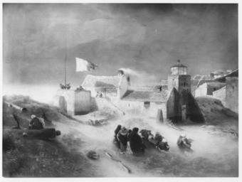 | Keywords: Andreas Achenbach - A Windy Day - Walters 37155.jpg Walters Art Museum artwork Creator Andreas Achenbach A fishing village is being lashed by a violent gale The fisherman's wives struggle across the dunes to mount an old fortification at the left Beyond are an Argand lighthouse and the village houses with red tile roofs glistening in a shaft of light that has pierced the glowering sky Several men struggle to raise a blue and white signal flag at a post near the sea's edge <br/> The former identification of the site as the coast at the village of Scheveningen near The Hague cannot be substantiated The presence of a lighthouse in close proximity to houses did not occur at Scheveningen nor elsewhere given the danger of fire 1870 oil mahogany cm 59 7 80 8 accession number 37 155 5990 John Wolfe New York date and mode of acquisition unknown John Wolfe Sale New York 1882 no 32 William T Walters city Baltimore Henry Walters city Baltimore Walters Art Museum Henry Walters Acquired by William T Walters 1882 Signature In red at lower left A Achenbach; Date In red at lower left 70 place of origin Rome Italy Walters Art Museum license 2D Paintings by Andreas Achenbach German paintings in the Walters Art Museum Landscape paintings of the Netherlands 1870 paintings Black and white reproductions of paintings in color 1870s landscape paintings |