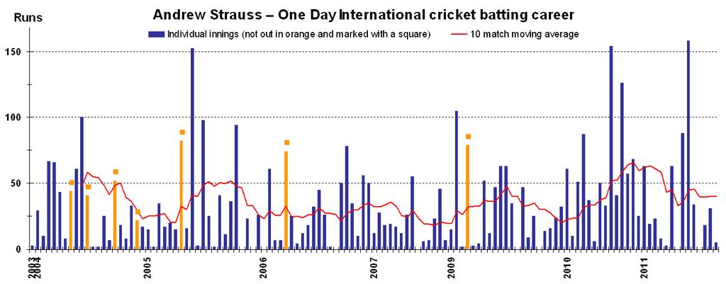 | Keywords: Andrew Strauss ODI batting career v2.png This graph details the w One Day International cricket performance of English cricketer w Andrew Strauss and was created by en wiki w user EdChem Each bar indicates a single ODI game blue ones for innings in which he was dismissed orange ones marked with a square for innings in which he batted but was not out The red line shows his 10 match moving average as at the end of each match An alternative version w File Andrew Strauss ODI batting career v1 png instead shows his career batting average <p>The graph was generated with Microsoft Excel 2003 the resulting chart being copied to Adobe Photoshop 9 and saved in png format using data from w Cricinfo http //stats espncricinfo com/ci/engine/player/20387 html class 2;template results;type batting;view innings and w Howstat http //www howstat com au/cricket/Statistics/Players/PlayerProgressBat_ODI asp PlayerID 3148 This version is current as at 23 January 2012 which is also the date it was prepared; it was uploaded the following day This graph details the w One Day International cricket performance of English cricketer w Andrew Strauss and was created by en wiki w user EdChem Each bar indicates a single ODI game blue ones for innings in which he was dismissed orange ones marked with a square for innings in which he batted but was not out The red line shows his 10 match moving average as at the end of each match An alternative version w File Andrew Strauss ODI batting career v1 png instead shows his career batting average <p>The graph was generated with Microsoft Excel 2003 the resulting chart being copied to Adobe Photoshop 9 and saved in png format using data from w Cricinfo http //stats espncricinfo com/ci/engine/player/20387 html class 2;template results;type batting;view innings and w Howstat http //www howstat com au/cricket/Statistics/Players/PlayerProgressBat_ODI asp PlayerID 3148 This version is current as at 23 January 2012 which is also the date it was prepared; it was uploaded the following day 24 January 2012 own EdChem talk Uploads other versions EdChem wikipedia en Cc-zero Original upload log page en wikipedia Andrew+Strauss+ODI+batting+career+v2 png wikitable - 2012-01-24 00 29 36 1340× 525× EdChem This graph details the One Day International cricket performance of English cricketer Andrew Strauss and was created by en wiki user EdChem Each bar indicates a single ODI game blue ones for innings in which he was dismissed orange ones ma - Uncategorized 2016 July 24 |
