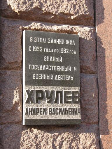 | Keywords: Andrey Khrulyov Plaque on House 9, Tverskaya str.,Moscow.jpg en Here lived a prominent Soviet military commander Andrey Khrulyov Moscow Tverskaya str 9 ru Здесь жил видный советский военачальник Анд ей Васильевич Х улёв осква Тве ская ул 9 own Vladimir OKC 2010-10-20 Tverskaya Street in Moscow 09 Memorial wall signs in Moscow Khrulyov Andrey People associated with World War II from the Soviet Union Khrulyov Andrey Government ministers the Soviet Union Khrulyov Andrey | ||||