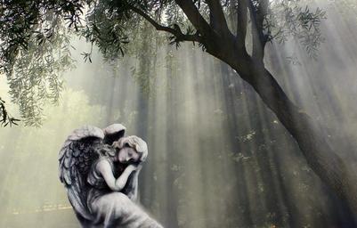Keywords: angel sculpture angel figure statue thoughtful kummer fig mourning memorial symbolism hope wing idyll melancholic peaceful lonely mystical mood fog light beam sunbeam tree log alone sit romantic atmospheric