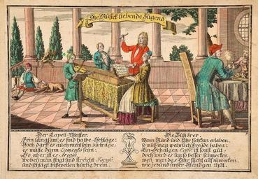 | Keywords: Angenehme Bilderlust c1760 07.jpg Die Musick-liebende Jugend und Zuhörer ; Tafel aus Anganehme Bilder-Lust der lieben Jugend zur Ergötzung also eingerichtet Nürnberg Monath o J ca 1760 http //www zisska de/ Zisska Schauer ~ 1760 Creator Unknown <gallery> File Angenehme Bilderlust c1760 01 jpg File Angenehme Bilderlust c1760 05 jpg File Angenehme Bilderlust c1760 06 jpg File Angenehme Bilderlust c1760 07 jpg File Angenehme Bilderlust c1760 08 jpg File Angenehme Bilderlust c1760 12 jpg File Angenehme Bilderlust c1760 15 jpg File Angenehme Bilderlust c1760 21 jpg File Angenehme Bilderlust c1760 23 jpg </gallery> PD-old-100 Images from Zisska Schauer 1760s engravings Chamber music in art Audiences Coffee in art |