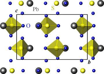 | Keywords: Anglesite structure bc.png en Crystal structure of anglesite PbSO4 Pbnm projected onto the b c plane Gray lead atoms yellow sulfur blue oxygen Data source S D Jacobsen J R Smyth R J Swope R T Downs Rigid-body character of the SO4 groups in celestine anglesite and barite The Canadian Mineralogist 36 1998 p 1053-1060 own Perditax 2010-09-27 Anglesite Lead compounds Crystal structures of sulfates Crystal structures in space group number 62 | ||||