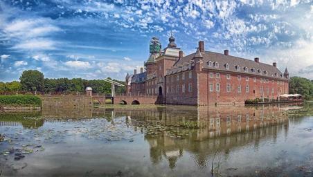 Keywords: isselburg germany sky clouds anholt landmark pond moat water reflections castle palace building bridge architecture