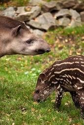 Keywords: animal baby brown cute grass mammal mother nose small spot stripe south american tapir tapirus together wild wildlife young zoo