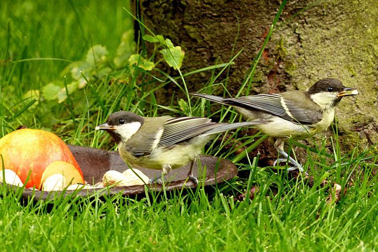Keywords: animal bird great tits parus major young foraging garden summer