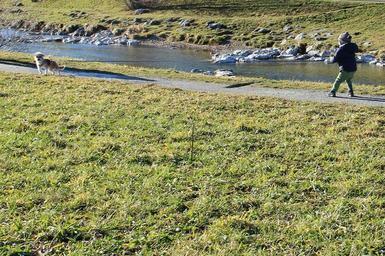 Keywords: animal dog play go walkies meadow go leash long leash water river bach human child