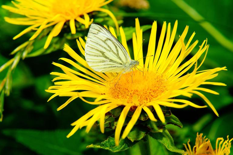 Keywords: animal insect butterfly white pieris brassicae sitting on flower yellow summer garden blossom bloom close yellow flower
