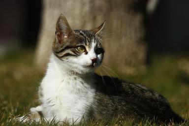 Keywords: animal overview outdoor cat gray fur white neck grass reach