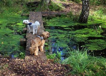 Keywords: animals dog web boardwalk transition water lake nature away swamp moor wooden bridge nature reserve wooden boards swampy