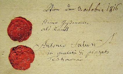 | Keywords: Anna Gassmann 3.10.1816.JPG ru Подписи и печати Анны Гассман и Антонио Салье и на б ачном конт акте Пите а Фукса 3 октяб я 1816 года A-Wsa Mag ZG A10 369/1831 1816-10-03 http //michaelorenz blogspot ru/2013/03/antonio-salieris-early-years-in-vienna html author other versions PD-Art Uploaded with UploadWizard Antonio Salieri |