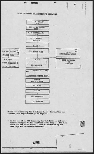 | Keywords: Annex No. 6 Chart of Command Organization for Operations - NARA - 193248.tif Scope and content Supplemental material used in Maxwell Taylor's report on the Bay of Pigs operation General notes 193248 Local identifier President 1961-1963 Kennedy Office of the Special Assistant to the President for National Security Affairs 01/20/1961 - 11/22/1963 NARA-Place Cuba North and Central America nation 4186389 21 5 -80 <br /> John F Kennedy Library NLJFK Columbia Point Boston MA 02125-3398 ca 04/1961 Record group Collection JFK-NSF Papers of President Kennedy National Security Files 01/20/1961 - 11/22/1963 Record group ARC 1164 Papers of President Kennedy National Security Files Countries compiled 01/20/1961 - 11/22/1963 Series ARC 193236 File unit Papers of President Kennedy National Security Files Countries Cuba Subjects Paramilitary Study Group Taylor Report 04/1961 - 07/1961 File unit ARC 193237 Variant control numbers NAIL Control Number NLK-NSF-CNTRYS-CUBASUBPSRTRANX-4DDDC yes Other versions NARA-cooperation PD-USGov Check categories-NARA 2011 September 13 Bay of Pigs Invasion Documents in English |