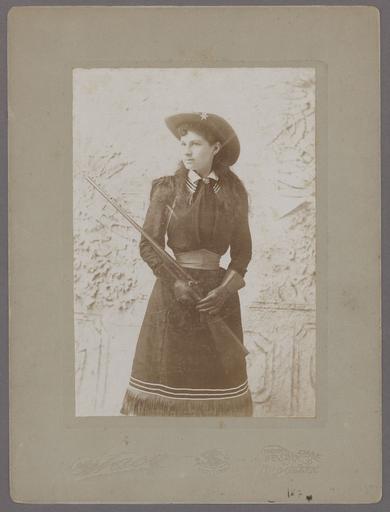 | Keywords: Annie Oakley by Charles Stacy, 1894.png Three-quarter standing portrait of Annie Oakley cradling a rifle wearing pearl earrings wide-brimmed hat with star pin mid-calf dress with three bands of light-colored ribbon above fringed hem matching bands of ribbon and fringe at top of dress wide belt white collar with broach or medal and extended-cuff leather gloves http //www dsloan com/Auctions/A22/item-photography-oakley-stacy html dsloan auctions 1894 Stacy Charles E photographer PD-old Annie Oakley 1894 portrait photographs |