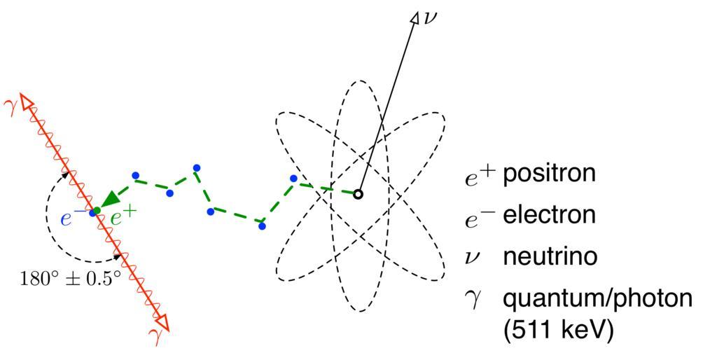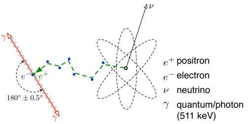 | Keywords: Annihilation.png Image of the annihilation process known in elementary physics It shows how a positron e+ is emitted from the atomic nucleus together with a neutrino v The positron moves then randomly through the surrounding matter where it hits several different electrons e- until it finally loses enough energy that it interacts with a single electron This process is called an annihilation and results in two diametrically emitted photons with a typical energy of 511 keV each However please note that under normal circumstances the photons are not emitted exactly diametrically 180 degrees This is due to the remaining energy of the positron and therefore of the conservation of momentum Esquema de una aniquilación electrón-positrón own work - part of PhD thesis http //nbn-resolving de/urn nbn de bsz 14-qucosa-23509 2009-07 Jens Maus http //jens-maus de/ Nuclear physics |