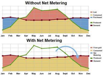 | Keywords: Annual Net Metering.png en Net metering is used on an annual basis to allow solar power generated during the summer to be used during the winter The meter runs backwards on sunny days and runs forward each night The consumer only pays for the net difference left over each month During summer months there is a surplus each month which is carried over until the fall and winter when it is consumed By spring it all equals out There are no monthly energy payments all year because the kilowatt hour credits generated during the summer are used during the winter The only charges are a connection fee to use the grid 2013-06-08 own Delphi234 cc-zero Uploaded with UploadWizard Photovoltaics |