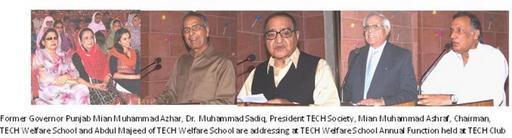 | Keywords: Annual Prize Distribution Ceremony of TECH Welfare School.jpg en Mian Muhammad Azhar Former Governor Punjab distributed prizes amongst TECH welfare school students today at TECH Club Lahore He said it is a unique welfare educational project being run by philanthropists of TECH Society by providing free education books uniforms and shoes to the kids of employees starting from nursary to 10th classes I have participated in many school functions but found that it was the unique one Mian Azhar added He also extended donation for the school children on this occasion Earlier Abdul Majeed Khan presenting his welcome note appreciated the efforts of Mian Azhar for supporting the needy students of the society Student girls and boys performed dress shows national songs and various skits Chairman of Board of Governors Mian Muhammad Ashraf and Principal Ifra Hashmi read note of thanks and report of the school own Nadeemakram 2011-04-11 Cc-zero Philanthropists |