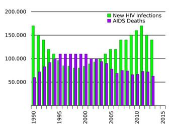 | Keywords: Annual Uganda AIDS deaths.svg translate yes en New HIV infections each year and AIDS deaths occurring during the year in Uganda; data from http //www unaids org/en/media/unaids/contentassets/documents/document/2014/2014gapreportslides/HIV2013Estimates_1990-2013_22July2014 xlsx UNAIDS GAP Report 2014 2014-10-19 own Delphi234 other versions cc-zero AIDS statistics Health in Uganda Uploaded with UploadWizard | ||||