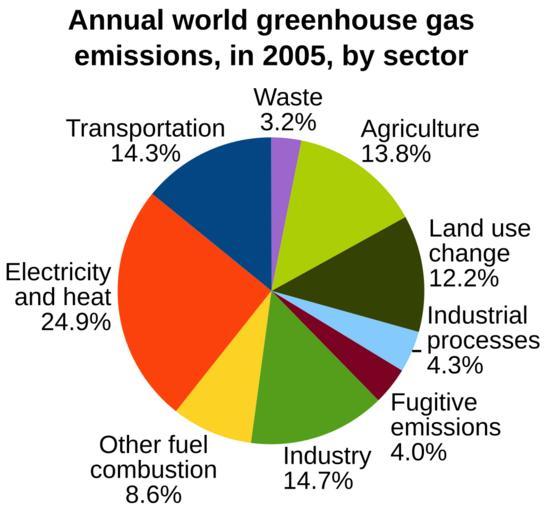 | Keywords: Annual world greenhouse gas emissions, in 2005, by sector.svg en This pie chart shows annual world greenhouse gas emissions in 2005 by sector Emissions are measured as a percentage of total world carbon dioxide equivalent emissions Electricity and heat 24 9 Industry 14 7 Transportation 14 3 Agriculture 13 8 Land use change 12 2 Other fuel combustion 8 6 Industrial processes 4 3 Fugitive emissions 4 0 Waste 3 2 Emissions due to land-use change include both emissions and absorptions i e processes that both add to and remove carbon from the atmosphere Emissions due to land-use change are highly uncertain References citation Herzog Timothy July 2009 World Greenhouse Gas Emissions in 2005 WRI Working Paper World Resources Institute WRI http //www wri org/publication/navigating-the-numbers Washington DC USA p 2 Vectorization of File Annual world greenhouse gas emissions in 2005 by sector png created by User Enescot Enescot 2012-11-23 vectorized 2013-07-08 Data Data from Herzog 2009 are given below as comma-separated values CSV The data were exported from OpenOffice 3 4 1 Calc using the following options enclosed in braces Character set Western Europe Windows-1252/WinLatin ; Field delimiter ; text delimiter <pre> Sector Percentage Transportation 14 3 Electricity and heat 24 9 Other fuel combustion 8 6 Industry 14 7 Fugitive emissions 4 Industrial processes 4 3 Land use change 12 2 Agriculture 13 8 Waste 3 2 </pre> Greenhouse emissions Global warming graphs Cc-zero |