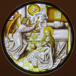 Keywords: Annunciation, Lower Rhine, c. 1520, stained glass - Museum Schnütgen - Cologne, Germany - DSC09844.jpg en Exhibit in the Museum Schnütgen - Cologne Germany 2015-11-29 07 51 22 own Daderot other versions PD-old-100 cc-zero Tondo windows of Museum Schnütgen The Annunciation on stained glass windows