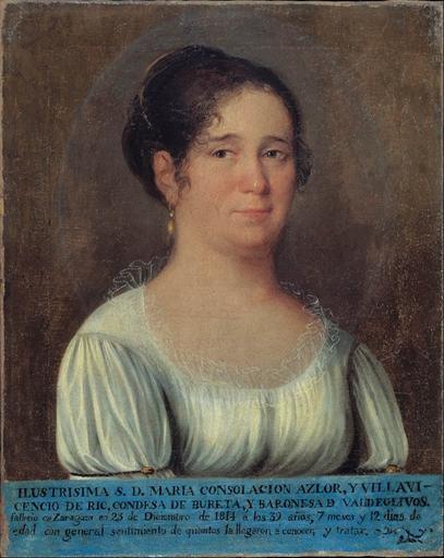 | Keywords: Anonymous Spanish Painter - María Consolación Azlor, Countess of Bureta - Google Art Project.jpg 1700 Spain 1700 1800 Spain 1800 None 407237 Spanish 1700 - 1800 /collection/fundacion-banco-santander/artwork/maria-consolacion-azlor-countess-of-bureta-anonymous-spanish-painter/416109/ Anonymous Spanish Painter Painter /artist/spanish-painter/4127100/ 4127100 /collection/fundacion-banco-santander/ Fundación Banco Santander 351009 http //www fundacionbancosantander com/ 11/25/2011 11 04 09 AM /collection/fundacion-banco-santander/artwork/maria-consolacion-azlor-countess-of-bureta-anonymous-spanish-painter/416109/ 1820 1820 Oil on canvas 510 416109 False 1820 Complete 3/24/2012 1 00 25 AM 32 http //www fundacionbancosantander com/coleccion/ /obra/32 http //www fundacionbancosantander com/ Fundación Banco Santander Fundación Banco Santander Painting 1820 1830 City Madrid Spain Exhibition w420 x h510 mm 1820 False 0 794921875 www fundacionbancosantander com Object maria-consolacion-azlor-countess-of-bureta-anonymous-spanish-painter María Consolación Azlor Countess of Bureta m 420 Inscribed on the painted cartouche running along the lower edge ILUSTRÍSIMA S D MARÍA CONSOLACLÓN AZLOR Y VILLAVICENCIO DE RIC CONDESA DE BURETA Y BARONESA DE VALDEOLIVOS Falleció en Zaragoza el 28 de diciembre de 1814 a los 39 años 7 meses y 12 días de edad con general sentimiento de quantos la Ilegaron a conocer y tratar Oil on canvas special url_id cQEIRky7t9Fg7g PD-old-100-1923 1800 Google Art Project works by unknown artist Spain Paintings of women 1820 paintings |