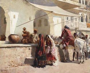 | Keywords: Another Rajasthani street scene by Edwin Lord Weeks.jpg en Another Rajasthani street scene by Edwin Lord Weeks 1887 probably in Udaipur Source http //www christies com/LotFinder/search/LotDetail asp sid highlights 3Cspan+class 3D 27esn 5Fsegment 27+title 3D 27 2FLotCommon 2FCatalogueEntry 27 3E 0AA+Street+Market+Scene 2C+ 3Cb 3E 3Cspan+class 3D 27esn 5Fhighlight 27 3EIndia 3C 2Fspan 3E 3C 2Fb 3E+ 26lt 3BBR 3C 2Fspan 3E+ 2E 2E 2E intObjectID 4800778 AllObjectIDs 4803582 4803587 4801548 4802265 4793188 4800859 4800778 4799488 4799822 4801547 4801555 4801581 4801553 4801340 4801558 4801556 4801554 4801482 4801559 4801557 RefineQueryURL AdvancedSearch 2Easp 3Fsid 3D 26entry 3Dindia 26T 3DLot 26P 3D 26CF 3D 26SU 3D1 26RQ 3DFalse 26AN 3D1 downloaded Oct 2006 Edwin Lord Weeks American 1849-1903 A Street Market Scene India; signed 'E L Weeks' and stamped with his Mogul device lower left ; oil on canvas 23¾ x 29 in 60 5 x 74 cm Painted circa 1887 Lot Notes A Street Market Scene India is a fine example of Edwin Lord Week's quotidian street scenes of northern India In these paintings Weeks demonstrated his great skills in draftsmanship color and texture in his precise yet suggestive visual records of his Indian travels-the very ordinariness of the scene contrasting sharply with the beautiful forms rich colors and textures of the elements and actors depicted The scene is entirely characteristic of north Indian city streets in which the street is the promenade and a row of shops occupy a built-up platform beneath an arcade of windows and bracketed balconies In the present work the city depicted is probably Udaipur then Oudeypore as suggested by the elaborate windows and shallow balconies depicted at the right side of the painting and by the white plaster covering thebuilding walls In his travel journal from the Black Sea through Persia and India Weeks wrote of Udaipur as 'an endless expanse of white ' The painting was executed circa 1887 in two stages Initially the architectural backdrop of the picture would have been painted in situ; a plein air rendering of the physical context The second stage of the painting would have been executed either while still in India or more likely some time later in the artist's studio in Paris In this second 'campaign' the figures and animals would have been added to the painting based upon a multitude of such elements and poses Weeks had executed in India The present painting is highly finished suggesting it was completed in Week's Paris studio a metalsmith's shop in the shadowed background of white walls and delicately fashioned arched openings The whitewashed setting serves as an an almost neutral background off which the artist plays with great still-life of dancing color and reflections - from a large copper pot to copper and brass jugs and bowls stacked on high The pot in the woman's hands brilliantly reflects the sunlight in its brassy colors and reflections The figures too are brilliantly rendered with variegated silk and cotton embroidered costumes and flowing translucent white muslin The women's arms are covered in silver bracelets their ears in long silver earrings and their necks in goldnecklaces - all of which suggests they may be nautch dancers from the Court The women's bare midriffs unusual in more southern parts of India caught Weeks' attention at the time 'In all the north country costumes there is a wide gap between the bodice and the skirts and the wearer never seems anxious to conceal it' Weeks' letter to the president of the Pennsylvania Academy of Fine Art September 18 1883 The painting relates to and very favorably compares to other Weeks paintings of this genre including A Street Scene in the East National Collection of Fine Arts Smithsonian Institution The Soldier of the Rajah Coming to the Sword Sharpener of Ahmedabad Portland Museum of Art and A Street Scene in North West India probably Udaipur sold at Christie's London 24 September 2003 lot 86 This last work shows a Rajput in blue silk on a similar horse and two young women dressed exactly like the two women in the present painting though rendered in shade instead of the brilliant light of the present work A favorite device in many of these paintings is a Rajput noble atop or standing next to his elaborately-saddled horse turned towards the shop fronts engaged in studying items for sale or often seen in flirtations with young women dressed in a manner similar to the figures in the present painting all with comely faces or profiles We are grateful to D Ellen K Morris for providing the catalogue entry for this work This painting will be included in the catalogue raisonné being prepared by Dr Ellen K Morris 1887 http //www columbia edu/itc/mealac/pritchett/00routesdata/1800_1899/women/balconies/balconies html creator Edwin Lord Weeks PD-old-100 Historical images of Udaipur Paintings of India by Edwin Lord Weeks 19th-century orientalist paintings 19th-century paintings location missing |