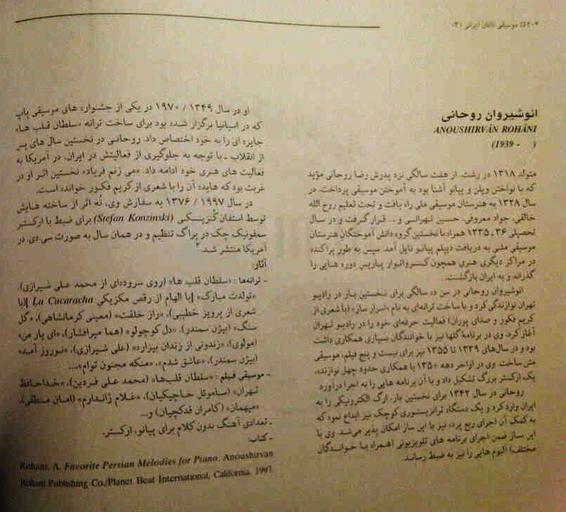 | Keywords: Anoushirvan Rohani page from the book PERSIAN MUSICIANS vol-3 by Pejman Akbarzadeh 2008.jpg Anoushirvan Rohani page from the book PERSIAN MUSICIANS vol-3 by Pejman Akbarzadeh 2008 jpg بخش ویژه انوشیروان روحانی در کتاب «موسیقی دانان ایرانی» نوشته پژمان اکبرزاده، نشر روشنک تهران با پشتیبانی انجمن میراث ایران در کالیفرنیا، 2008 در بخشی از متن به ترانه «تولدت مبارک» اشاره شده که با الهام از رقص مکزیکی/اسپانیولی «لاکوکوراچا» ساخته شده است own 01-02-2008 Pejman Akbarzadeh PermissionOTRS 2013030510011556 Persian music Music of Iran |