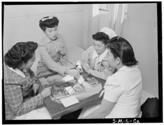 Keywords: Ansel Adams Manzanar - Bridge game, Nurse Aiko Hamaguchi, Nurse Chiye Yam - LOC ppprs-00107.jpg en Original caption Bridge game Nurse Aiko Hamaguchi Nurse Chiye Yamanaki Miss Catherine Yamaguchi Miss Kazoko Nagahama Manzanar Relocation Center California 1943 LangSwitch From the http //www loc gov/pictures/collection/manz/ Ansel Adams's Photographs of Japanese-American Internment at Manzanar collection at the http //loc gov Library of Congress ppprs 00107 Creator Ansel Adams This collection is in the public domain but privacy and publicity rights may apply When images are reproduced in a publication the Library requests that the reproduction number be published with the credit as in the following example Library of Congress Prints and Photographs Division LC-A35-4-M-10 http //www loc gov/rr/print/coll/109_anse html Ansel Adams Photographs by Ansel Adams of Manzanar War Relocation Center