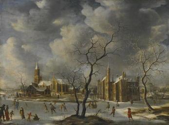 Keywords: anthony beerstraten art artistic artistry painting oil on canvas landscape nature outside sky clouds country countryside trees churches buildings people skating winter snow ice water frozen lake