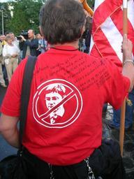 | Keywords: Antigyurcsany.jpg 2006 anti-government protest Miskolc Hungary The text written on the T-Shirt Our troops are engaged <br> but the government is still in its position <br> Can this stay like this Countdown 10 9 8 <small> cannot be seen further </small> <br>2006 IX 18 MISKOLC<br>City Hall Square 17<sup>30</sup> Monday<br>IX 19 17<sup>30</sup> Tuesday<br>IX 20 17<sup>30</sup> Wednesday The picture of Ferenc Gyurcsány is crossed the text on it žWe lied own Own photo 2006-09-20 User Alensha Protests against the Government of Hungary 2006 Red T-shirts Ferenc Gyurcsány Red T-shirts - back Political anti logos Red circle with right slash |