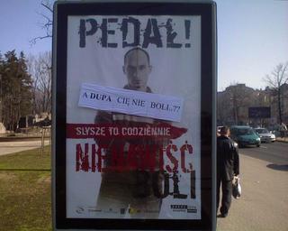 Keywords: AntiHomoPL.jpg pl Polska Zwandalizowany plakat przeciw mowie nienawiści wobec osób homoseksualnych en Poland Anti-discrimination poster remade by the someone The text on the poster says Faggot I hear it everyday Hate hurts Someone placed piece of white paper in the middle which says Your ass doesn't hurt you My photo camera ArPol Photo has been uploaded on Polish site called wrzuta pl by me two years ago Homophobia in Poland