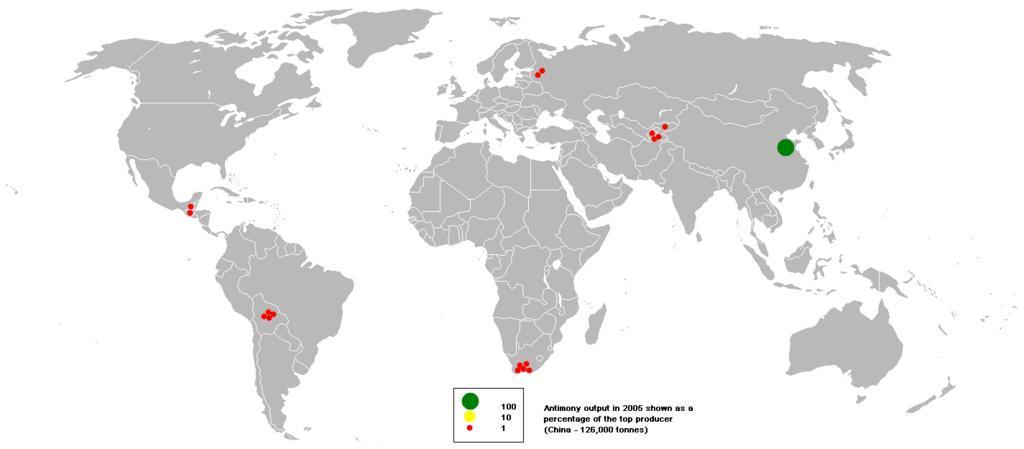 Keywords: Antimony (mined)2.PNG This bubble map shows the global distribution of antimony output in 2005 as a percentage of the top producer China - 126 000 tonnes This map is consistent with incomplete set of data too as long as the top producer is known It resolves the accessibility issues faced by colour-coded maps that may not be properly rendered in old computer screens Data was extracted on 31st May 2007 Source - http //www bgs ac uk/mineralsuk/commodity/world/home html Based on Image BlankMap-World png http //en wikipedia org/wiki/Image Antimony_ 28mined 292 PNG 14 56 31 May 2007 Anwar saadat en English Wikipedia Anwar saadat Check categories 2008 August 21 Antimony Bubble maps |