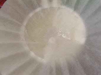 Keywords: Antimony oxychloride.JPG en Antimony oxychloride precipitate on filter paper before drying own Chemicalinterest Antimony trioxide Antimony trichloride