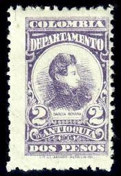 | Keywords: Antioquia 1903-04 Sc153.jpg José Custodio Cayetano García Rovira the Neogranadine general Catalogue Sc 153 1903 1904 Scan of original Colombian government PD-old-100 PD-Colombia Stamps of Antioquia 1903 stamps purple stamps Presidents of the Provincias Unidas de Nueva Granada |