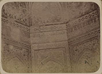 | Keywords: Antiquities of Samarkand. Inner Courtyard of the Shir Dar Madrasah. Inscriptions around the Inner Niche and Its Upper Sections. Center WDL3834.png Artwork ru Богаевский иколай Владими ович 1843 1912 гг fr Bogaevskii Nikolaï V 1843-1912 en Bogaevskii Nikolai V 1843-1912 zh 亚历山大·L· ,1840-1888 年 pt Bogaevskii Nikolai V 1843-1912 ar بوغافسكي، نيكولاي ف ، 1843-1912 es Bogaevskii Nikolai V 1843-1912 ru Сама кандские д евности Внут енний дво мед есе Ши -До адписи вдоль внут енней ниши и в ве хней ее части Се едина fr Antiquités de Samarcande Cour intérieure de la madrasa de Shir Dar Inscriptions autour de la niche intérieure et ses sections supérieures Centre en Antiquities of Samarkand Inner Courtyard of the Shir Dar Madrasah Inscriptions around the Inner Niche and Its Upper Sections Center zh 撒马尔罕古迹 尔·达伊斯兰教学校内部庭院 内部壁龛四周的铭文及壁龛的上半部分 中间部分 pt Antiguidades de Samarcanda Pátio interno da madrassa Shir Dar Inscrições em torno do nicho interno e suas seções superiores Centro ar آثار سمرقند الفناء الداخلي لمدرسة شير دار نقوش حول المِشْكاة الداخلية وأجزائها العلوية المنتصف ru Эта фотог афия внут еннего дво а мед есе Ши -До в Сама канде Узбекистан соде жится в а хеологической части <em> Ту кестанского альбома </em> Шеститомное фотог афическое исследование было подготовлено и издано в 1871 1872 гг под пат онажем гене ала Константина П фон Кауфмана пе вого гене ал-губе нато а 1867 1882 гг Ту кестана как называли в то в емя те ито ию Цент альной Азии п инадлежавшую Российской импе ии В альбоме уделяется особое внимание исламской а хитекту е Сама канда в том числе памятникам XIV и XV вв пе иода п авления Тиму а Таме лана и его п еемников В цент е Сама канда находится ансамбль Регистан объединяющий в себе т и основных об азца <em>madrasah</em> мед есе елигиозных школ Вто ая мед есе в ансамбле Ши -До была пост оена в 1619 1636 гг во в емена династии Ашта ханидов есмот я на значительные пов еждения нанесенные мед есе в течение многих веков она остается одним из самых богато ук ашенных памятников в Цент альной Азии Фо ма этой мед есе п едставляет собой п ямоугольный дво ок уженный двухэтажной а кадой а снимке видна ве хняя часть ниши <em>айвана</em> сводчатого зала с одним отк ытым концом ок уженного с т ех сто он стенами в цент е южной стены Пове хности пок ыты многоцветной плиткой майоликой об азующей сложные геомет ические и ботанические узо ы П ямоугольные панели со ст ельчатыми а ками ведут к го изонтальной полосе с надписью в укописном стиле сулюс ад надписью находятся ост оконечные а очные панели азделенные системой пе есекающихся еб истых сводов <br>А хитекту ные ук ашения и деко ативные элементы; адписи; Исламская а хитекту а; ед есе; Фотог афические исследования fr Cette photographie de l'intérieur de la cour de la madrasa de Shir Dar à Samarcande Ouzbékistan est extraite de l'ouvrage archéologique <em>Album du Turkestan</em> Cet inventaire photographique en six volumes fut réalisé entre 1871 et 1872 sous le patronage du général Konstantin P von Kaufman premier gouverneur général 1867-1882 du Turkestan nom donné aux territoires d'Asie centrale de l'Empire russe L'album consacre une attention particulière à l'architecture islamique de Samarcande avec notamment des monuments datant des XIV<sup>e</sup> et XV<sup>e</sup> siècles lors du règne de Tamerlan et de ses successeurs Situé au centre de Samarcande l'ensemble du Registan est composé de trois exemples majeurs de <em>madrasa</em> école religieuse La madrasa de Shir Dar seconde de l'ensemble fut construite entre 1619 et 1636 au cours de la dynastie astrakane Malgré les dommages considérables subis au cours des siècles elle demeure l'un des monuments les plus luxueusement décorés d'Asie centrale Cette madrasa est formée d'une cour rectangulaire entourée d'une arcade à deux étages Cette vue présente la partie supérieure de la niche de l'<em>aivan</em> salle voûtée dotée de trois murs et d'un côté ouvert au centre du mur sud Les surfaces sont recouvertes de carreaux de majolique polychromes formant des motifs géométriques et floraux complexes Les panneaux rectangulaires dotés d'arches pointues orientent le regard vers une bande d'inscription horizontale en style cursif thoulouth Au-dessus de l'inscription des panneaux sont divisés selon un système de voûtes striées entrelacées <br>Décorations et ornements architecturaux; Inscriptions; Architecture islamique